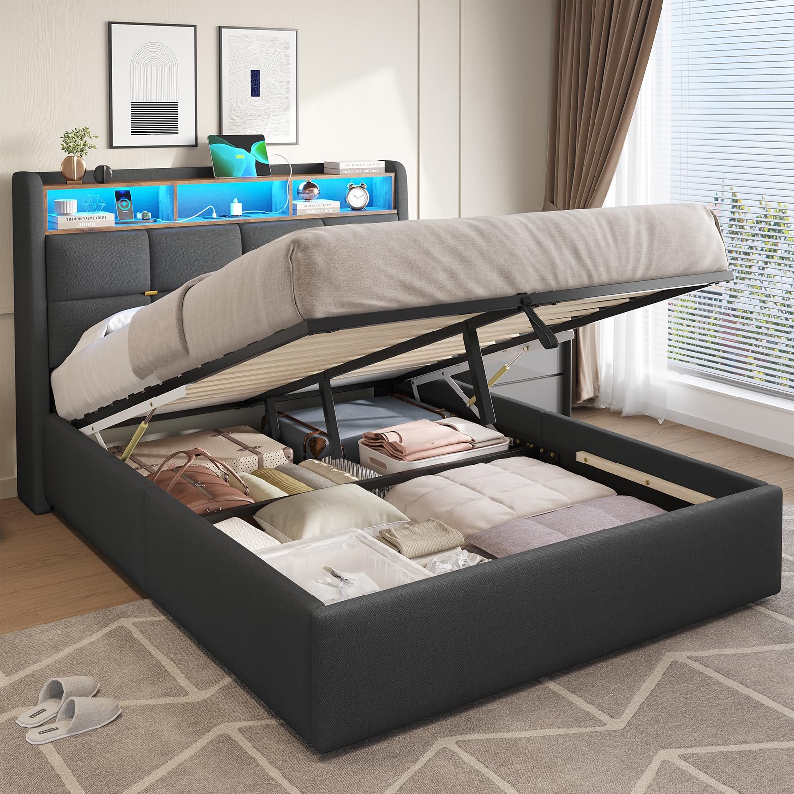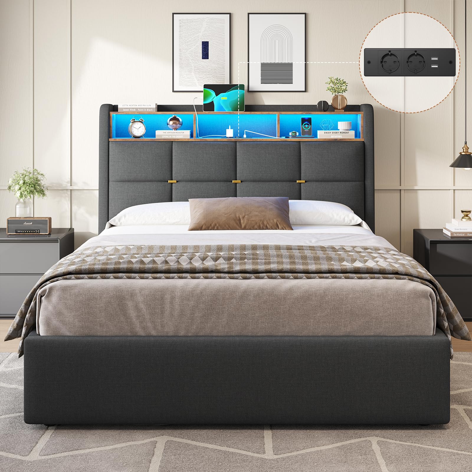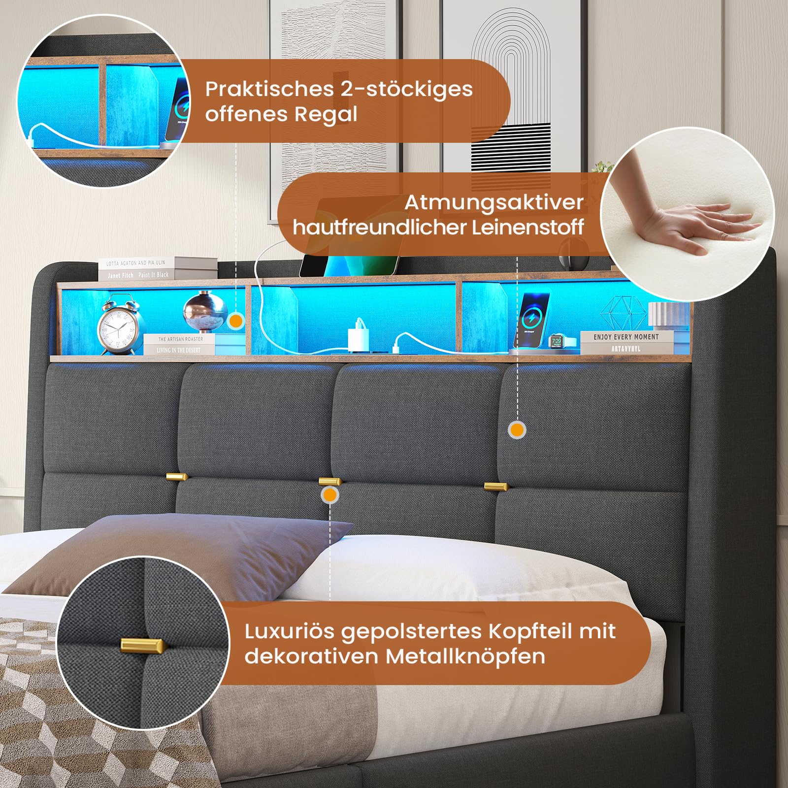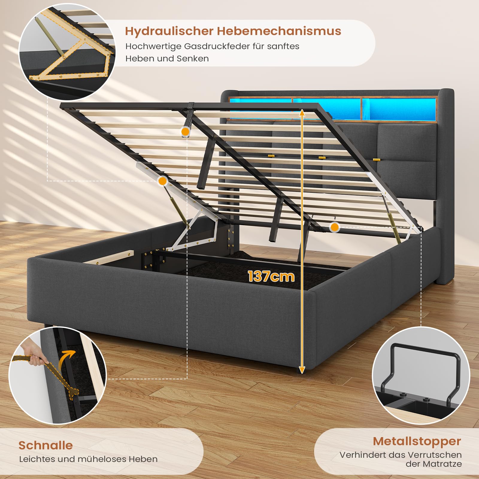 DICTAC Polsterbett 140x200cm, hydraulischer Stauraum, LED & Steckdosen, Lattenrost & Bettkasten, Doppelbett mit USB & Kopfteil, Dunkelgrau