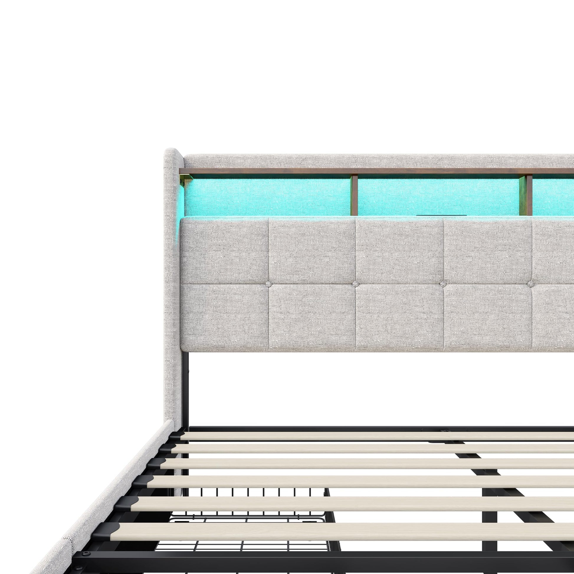 Polsterbett 140x200 cm,LED Doppelbett mit 4 Schubladen und Lattenrost,Kopfteil mit stauraum und USB-Ladefunktion,Bett Funktionsbett Stauraumbetten Jugendbett Rückenlehne Bettgestell,Leinen,Beige